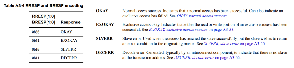 AXI Bus의 경우 위와 같이 OKAY, EXOKAY, SLVERR, DECERR이라는 총 4개의 Response를 가지는 2-bit Response Signal이 존재합니다.