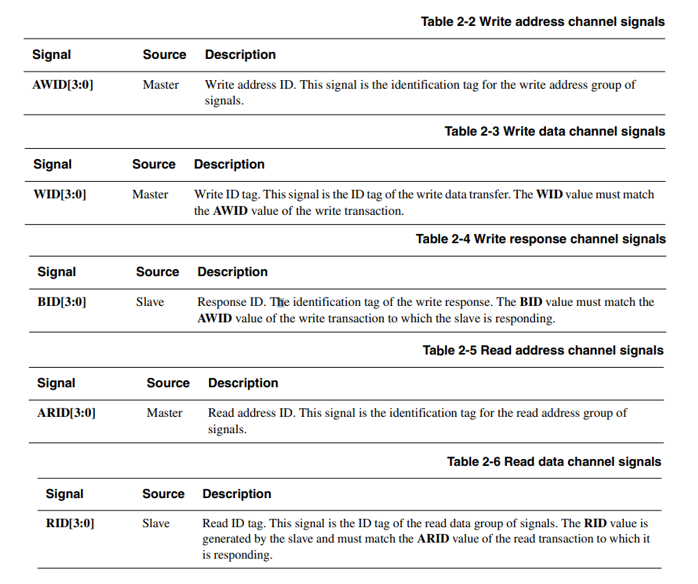 위와 같은 Multiple Outstanding Address과 Out of Order 특징은 AXI를 더욱 빠르고 더 좋은 Performance를 가진 Bus로 만들어주게 되겠지만 이를 구현하려면 또 Signal이 필요하겠죠.
