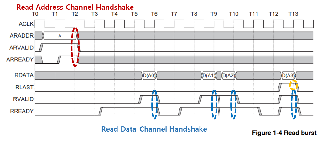 ARVALID와 ARREADY가 HIGH가 되면서 Read Address Channel에서 HandShake가 일어나 Address가 전송되고