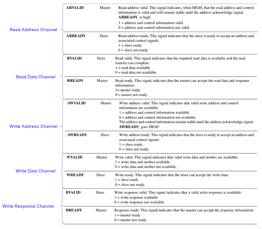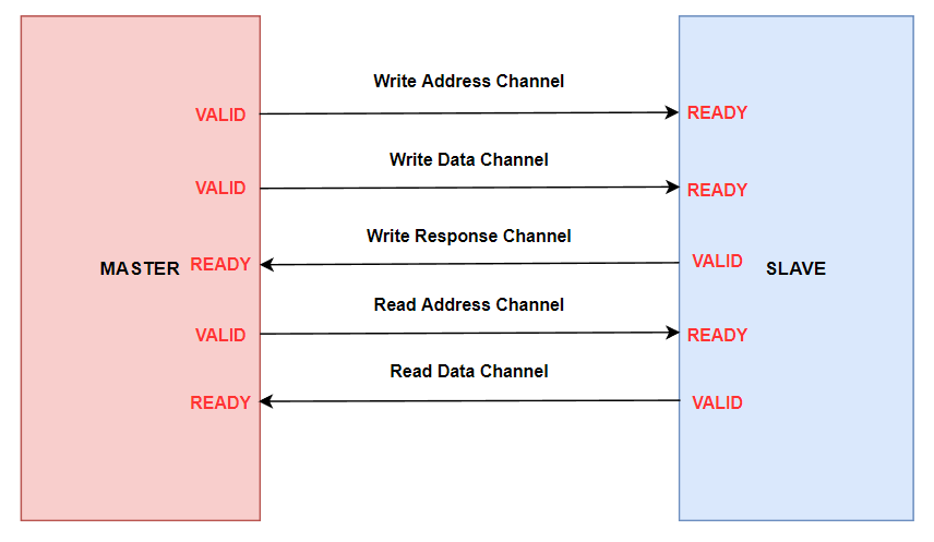 Master가 준비가 됐을 때 VALID를 보내고 Slave가 받을 준비가 됐을 때 READY를 보냅니다.