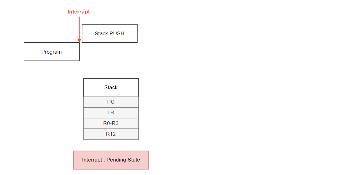 현재 실행중인 Program 관련한 정보를 담고있는 R0-R3, R12, PC, LR 등이 Stack에 PUSH 됩니다.