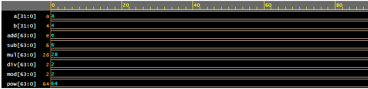 결과가 Hex로 표현되어 있는데 add의 결과를 보면 e(10+4 = 14), sub의 결과 6(10-4 = 6), mul의 결과 28(10*4 = 40),
